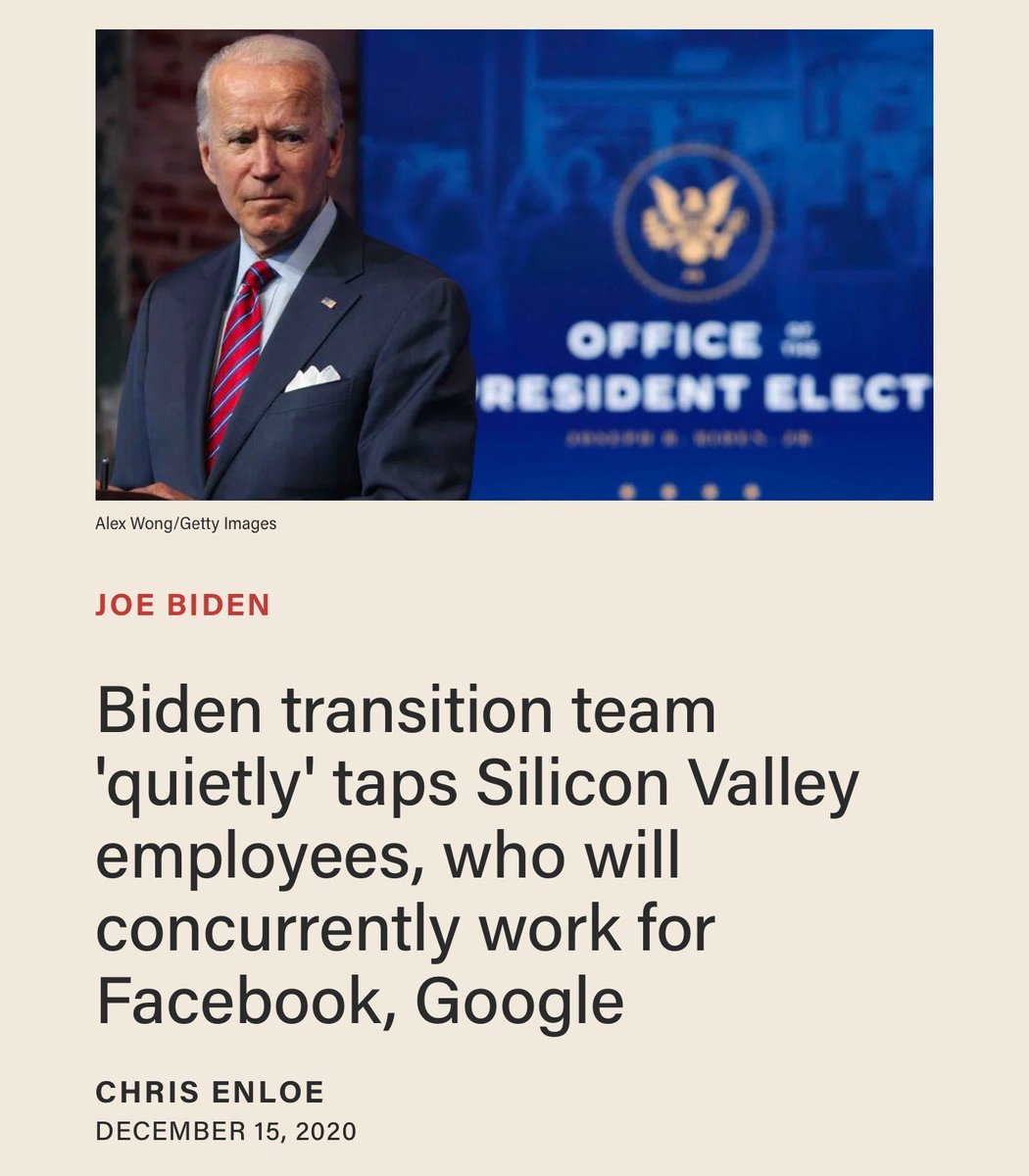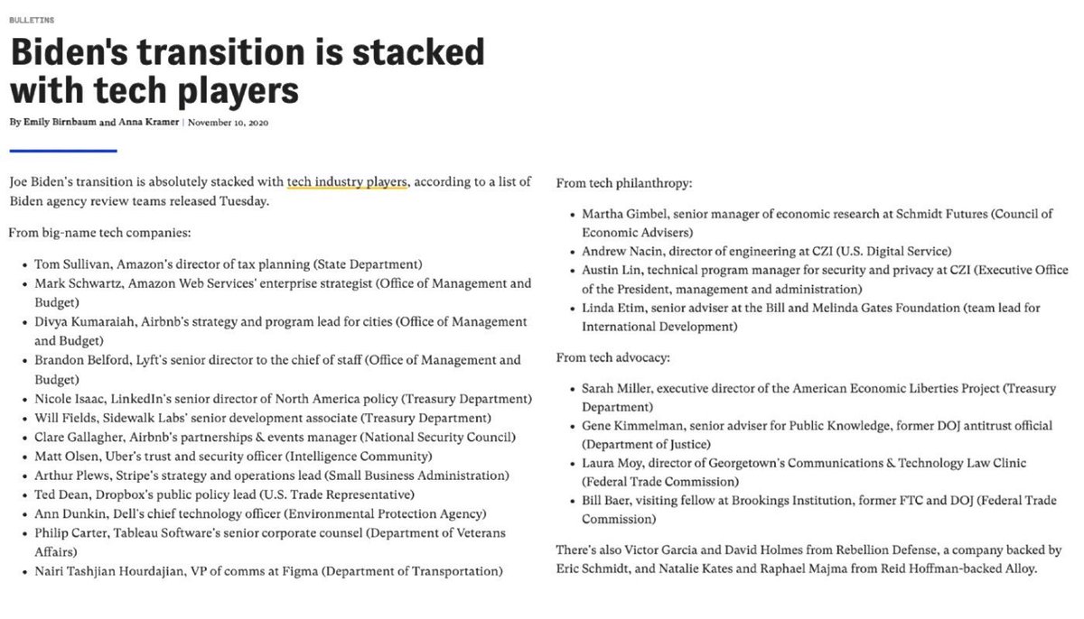 Biden's transition team was STACKED with tech insiders. They staffed the entire executive branch—State, Treasury, EPA, OMB, etc. Many of them were Obama alumni. When Obama left office, they went to work in tech. When Biden's presidency began, they transitioned right back in. https://t.co/JLJxbD0amy