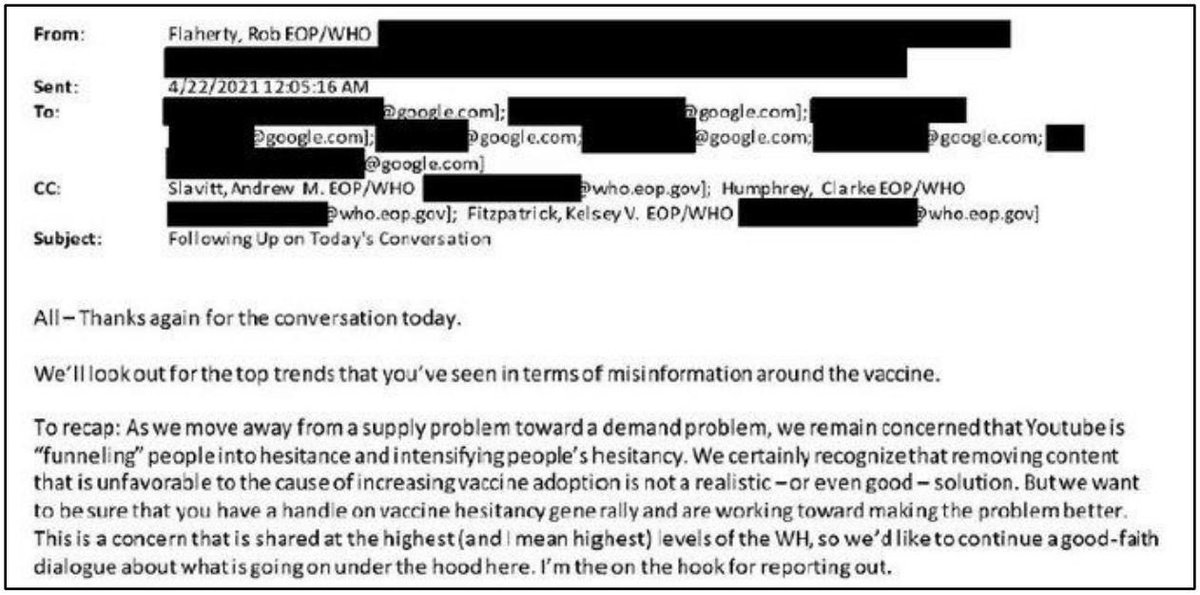 And Biden officials didn't just "flag" content. They pushed platforms to transform their algorithms to suppress ideas they disliked. In an email, Biden's Digital Director told YouTube that "this is a concern that is shared at the highest (and I mean highest) levels of the WH." https://t.co/ygBLdqFIuX