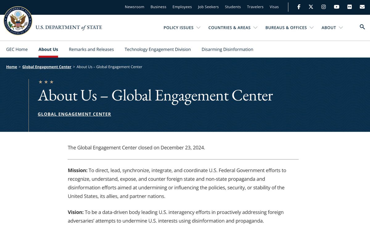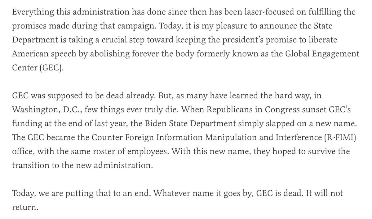 Last year, I led a fight in Congress to shutter the GEC for good. The agency was supposed to sunset at the end of 2024. But the Biden State Department simply renamed it, kept all the same employees, and tried to smuggle it into the next administration. https://t.co/Zfmi7fDTys