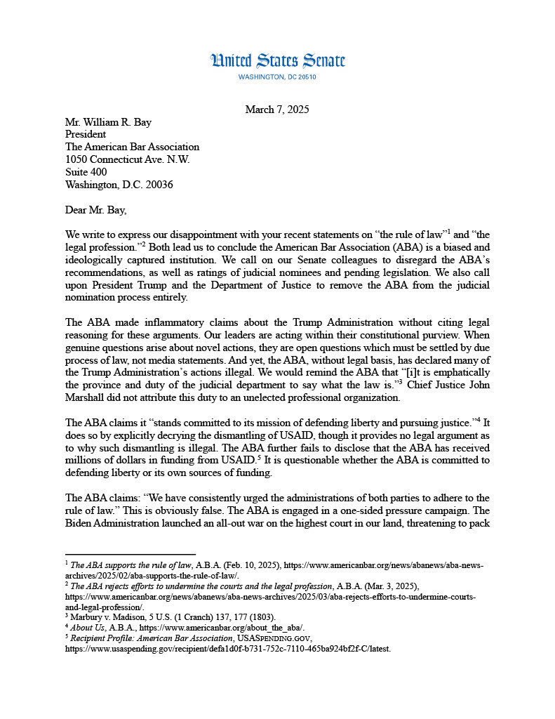 On Feb. 10 and Mar. 3, the ABA sent two highly partisan statements parroting leftist talking points and saying "Americans expect better." https://t.co/tHbJ1X1Sce