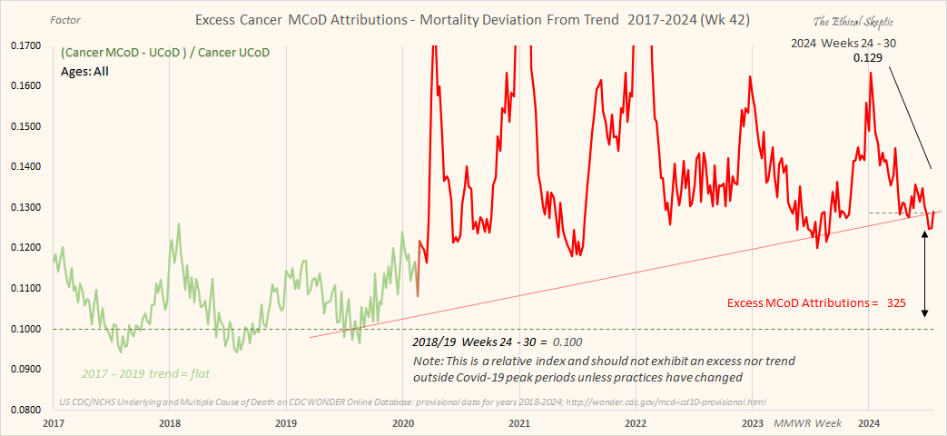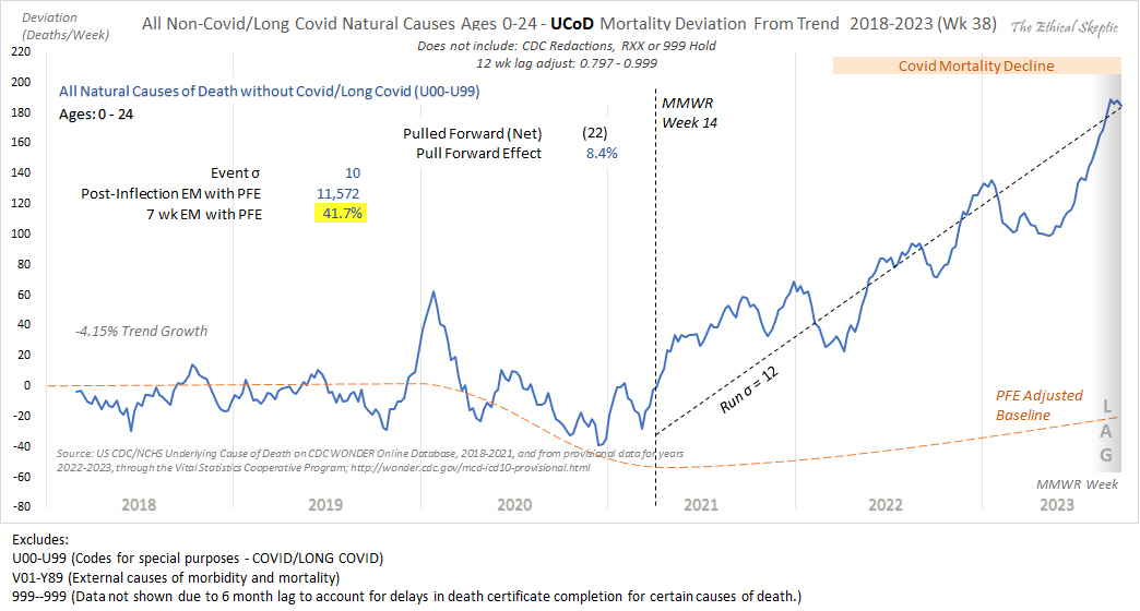 42% excess natural cause mortality in 0-24 yr-olds. This bend in the DFT line is called an inflection. One cannot adjust chart parameters to make this bend in the DFT line disappear. It suggests the introduction of a novel influence around Wk 14 2021. This is unequivocal.