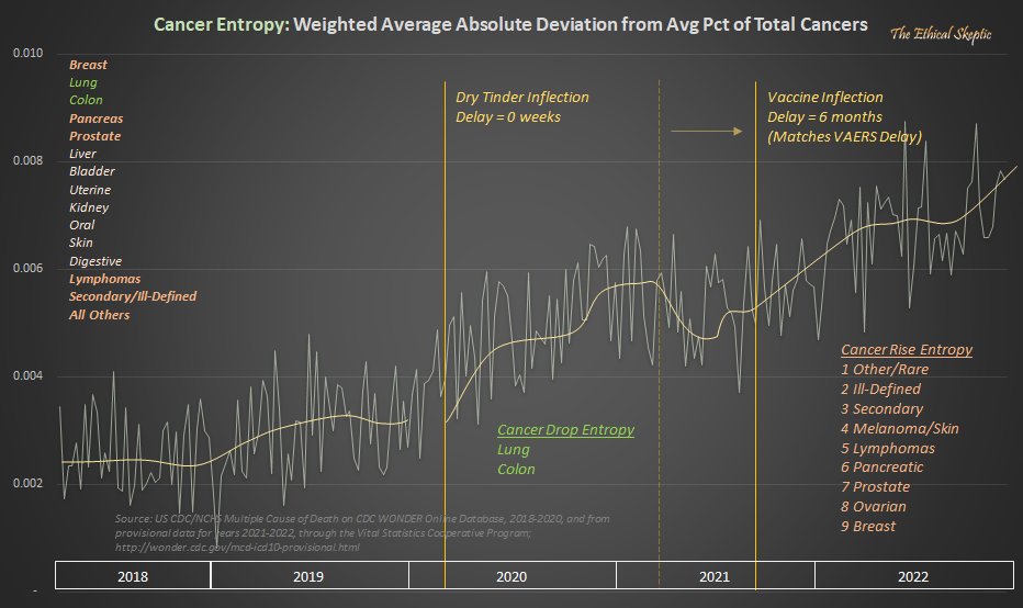 Another example resides in the arrival of Shannon Entropy in terms of cancers, after the vaccine was introduced. This pertains to the chaotic increase in rare cancers, while at the same time, the big cancers went DOWN - disproving the notion that 'deferred screenings' were the cause of this. Unless you have run this analysis, you should not be making conclusions about where cancers are headed.