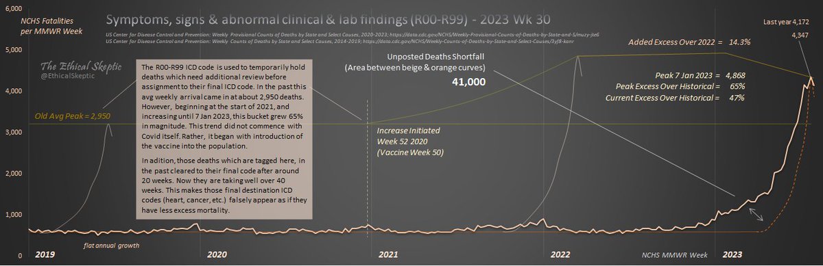 @OS51388957 The unposted RXX balance as of Wk 30 2023 is 41,000 deaths Most of the external deaths are held in 999 code - but of this RXX excess, most are natural cause. From what I have seen, a minority erode from the tail of this curve each 4/5 week iteration. But remember, many of these…