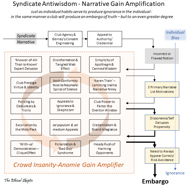 In Aldous Huxley's "Brave New World," brainwashing is achieved through a form of affirmative sleep programming called Hypnopaedia. However, in our present reality, there is an intriguing contrast. Those who believe themselves to be awakened are paradoxically deeply influenced solely by a prevailing 'Narrative of Embargo'. These participants regard themselves to be guardian gods of knowledge - with the authority to cancel as they see fit, and not merely the recipients of affirmations therein. They are sciebam, not science. Science = 'We will find out' Sciebam = 'I already know' (religion with p-values) This is why I reject modern embargo-skepticism. It is a claim to godlike status.