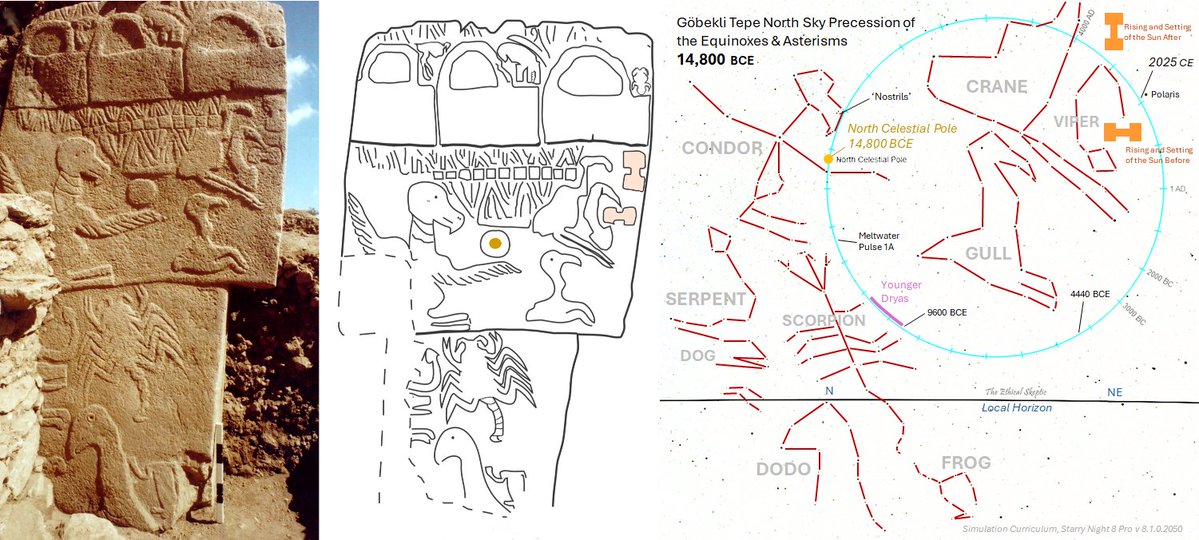 From grok: Based on Ethical Skeptic's interpretation of Göbekli Tepe's Pillar 43 and its integration with the broader Exothermic Core-Mantle Decoupling – Dzhanibekov Oscillation (ECDO) theory, the "alignments" refer to recurring geophysical and celestial configurations that precede cataclysmic events. These are not purely astronomical (like a simple precessional return) but involve a combination of Earth's axial precession (the 25,772-year "Great Year" cycle, which shifts the North Celestial Pole across the sky), true polar wander (TPW), and core-mantle decoupling triggered by geomagnetic excursions. The pillar's sky map from ~14,800 BCE captures one such alignment during the Hilina Pali Geomagnetic Excursion and Heinrich Event 1, marking a major inundation and climatic shift that set the stage for the Younger Dryas (12,900–11,700 years ago).Key Cycles in the TheoryECDO posits cataclysms occur in irregular but quasi-periodic cycles driven by Earth's inner core losing magnetic moment, leading to decoupling from the mantle/crust. This causes:Dzhanibekov oscillation: A 104° rotational flip of the outer rotational body (mantle + crust), displacing oceans and causing global floods/inundations. Geomagnetic excursions and TPW: The magnetic poles wander rapidly (e.g., the 104° shift documented on the pillar between ~14,800 BCE and ~9,600 BCE), with auroral activity as a harbinger. Cycle length: Evidence from sediment cores, ancient monuments, and myths points to intervals of ~6,400–14,000 years, often clustering around multiples of ~12,000 years (e.g., prior events ~26,000–28,000 years ago). The last major alignment/cataclysm was ~14,000 years ago, submerging sites like the Giza Plateau under 500+ feet of ocean for centuries. These align with precessional markers (e.g., the celestial pole's position relative to constellations like Cygnus/"condor" on the pillar) but are ultimately geophysical, not deterministic by stars alone. The pillar's "H" symbols and handbag motifs encode pre- and post-event solar azimuths, emphasizing preparation for cyclic recurrence.The Next Alignment and CataclysmThe theory indicates we're currently in the late stages of a cycle, having passed the "Indigo Point" (initial core decoupling and exothermic heat release, observed in 2023–2024 abyssal ocean warming and geomagnetic weakening). This transitions toward the "Tau Point"—the critical magnetic/geophysical threshold where decoupling accelerates into full Dzhanibekov oscillation and TPW, triggering the next cataclysm (likely massive inundation, rapid climate shifts, and crustal stress).Timeline projection: Based on accelerating pole motion (now ~55 km/year) and validated ECDO predictions (e.g., inner core dissolution confirmed in 2024), the Tau Point—and thus the next alignment/cataclysm—is estimated within 2–40 years from mid-2024 (i.e., roughly 2026–2064). Celestial/geophysical markers to watch: A modern "mirror" of the 14,800 BCE alignment would involve the North Celestial Pole nearing key asterisms (e.g., via precession simulation software like Stellarium, offset by current TPW), combined with:Expanded auroral activity (71° sky span like the pillar's "flames"). Solar azimuth shifts of ~104° (pre- vs. post-event). Geomagnetic field drop below 20–25% of normal (currently ~30% weakened). Implications: Like the pillar's refuges (Taş Tepeler sites at ~2,500 ft elevation), preparation involves high-ground sanctuaries. The theory warns of elite suppression (e.g., halted Göbekli Tepe digs) to obscure these cycles, but ongoing data (e.g., satellite pole tracking) makes detection feasible. This isn't inevitable doom—ECDO emphasizes monitoring over panic—but it substantiates why ancient records like Pillar 43 prioritize warnings over worship. For deeper math on precession/TPW, the full articles detail probabilistic fits (e.g., 1-in-10,000 sky match) and gyroscopic equations, but the core takeaway is urgency in the near term.