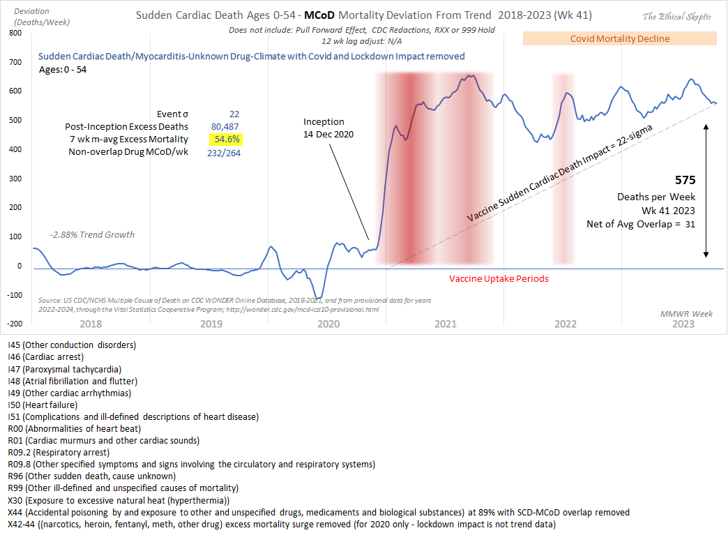 "One of the things that makes us believe that these really are direct or indirect COVID is the causes of death tend to be comorbid with COVID. Alzheimer’s, diabetes, things like that, but in addition they tend to move with the COVID deaths." This is not true - diabetes and alzheimers (left panel) are not up over their generational trends. The rise is in non-traditional death ICD codes (right panel). Nor do they actually move with Covid deaths at all, (third panel). This indicates a toxin-like effect, not a specific pathogen. Actuaries are not taught systems analytics.
