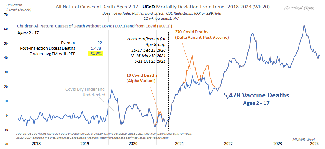 This is the pièce de résistance. Ages 2-17 Covid Deaths = 280 (270 post-vaccine) Ages 2-17 Post Inflection Excess Deaths = 5,478 The worst part: this 22-sigma event has not ended. 😡😡😡 https://t.co/7sicbDvMgi