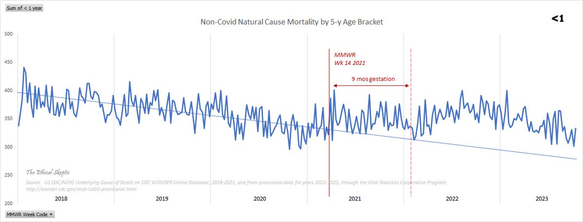 Deaths of infants less than a year old from Non-Covid Natural Causes. Bears two inflections. First occurs wk 14 2021 and introduces a phased impact upon gestation. Second happens once full gestation window is essentially ended. This shows the graduated impact of the vaccine on unborn children of vaccinated mothers. Unequivocal 27% excess by early 2023 Last 26 weeks are depressed by 999 death cert categorizations (not included in this chart).