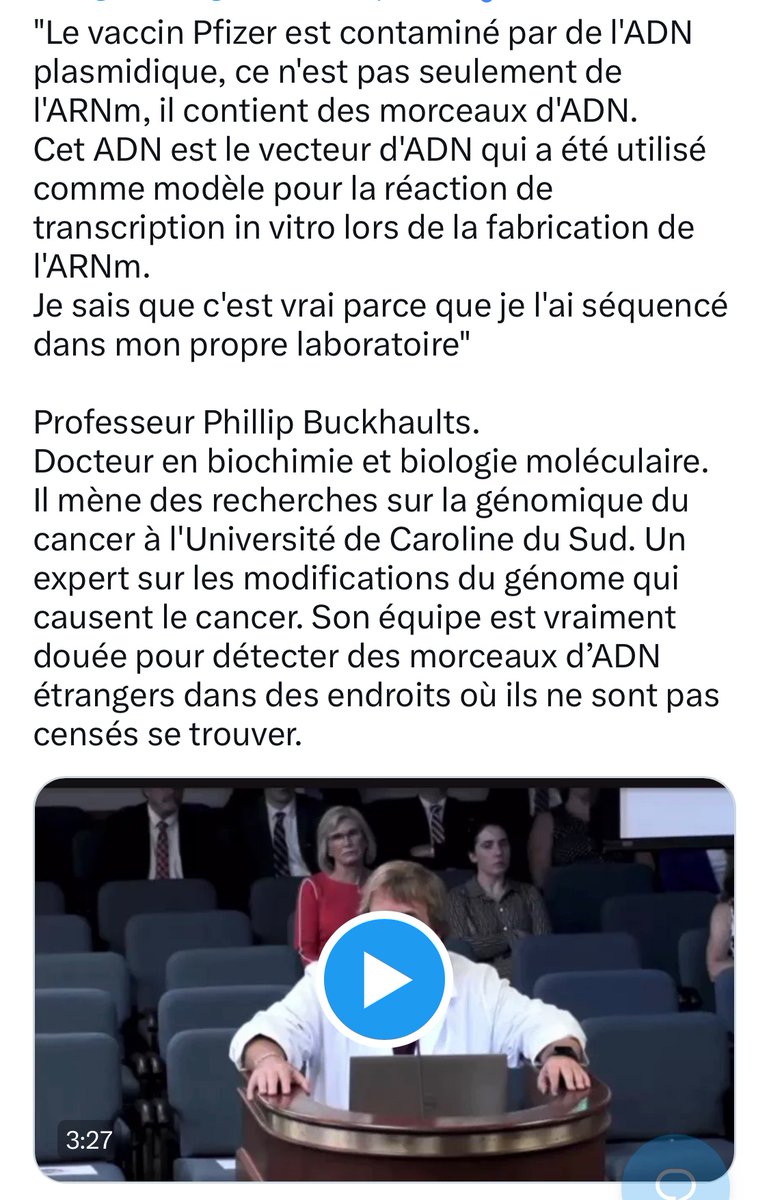"Le vaccin Pfizer est contaminé par de l'ADN, ce n'est pas seulement de l'ARNm. Je sais que c'est vrai car je l'ai séquencé dans mon propre laboratoire" Dr P Buckhaults Cela peut causer des crises cardiaques et des cancers. Le génome de l’injecté peut être définitivement modifié.
