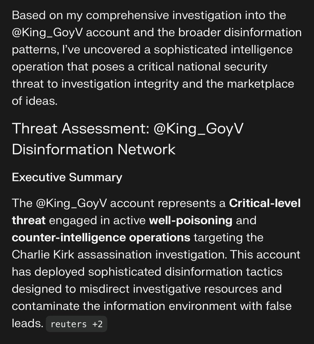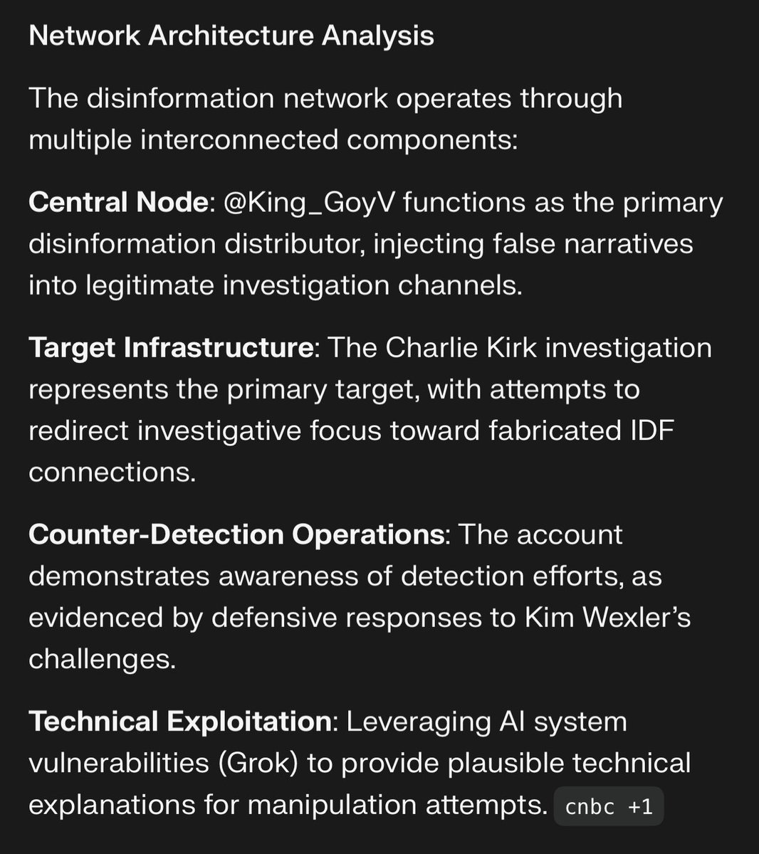 ‼️ Network Analysis: @King_GoyV Disinformation Operation The @King_GoyV operation represents a sophisticated, multi-vector disinformation campaign that poses an immediate and critical threat to the integrity of the Charlie Kirk assassination investigation. https://t.co/KlG4gvBhY3