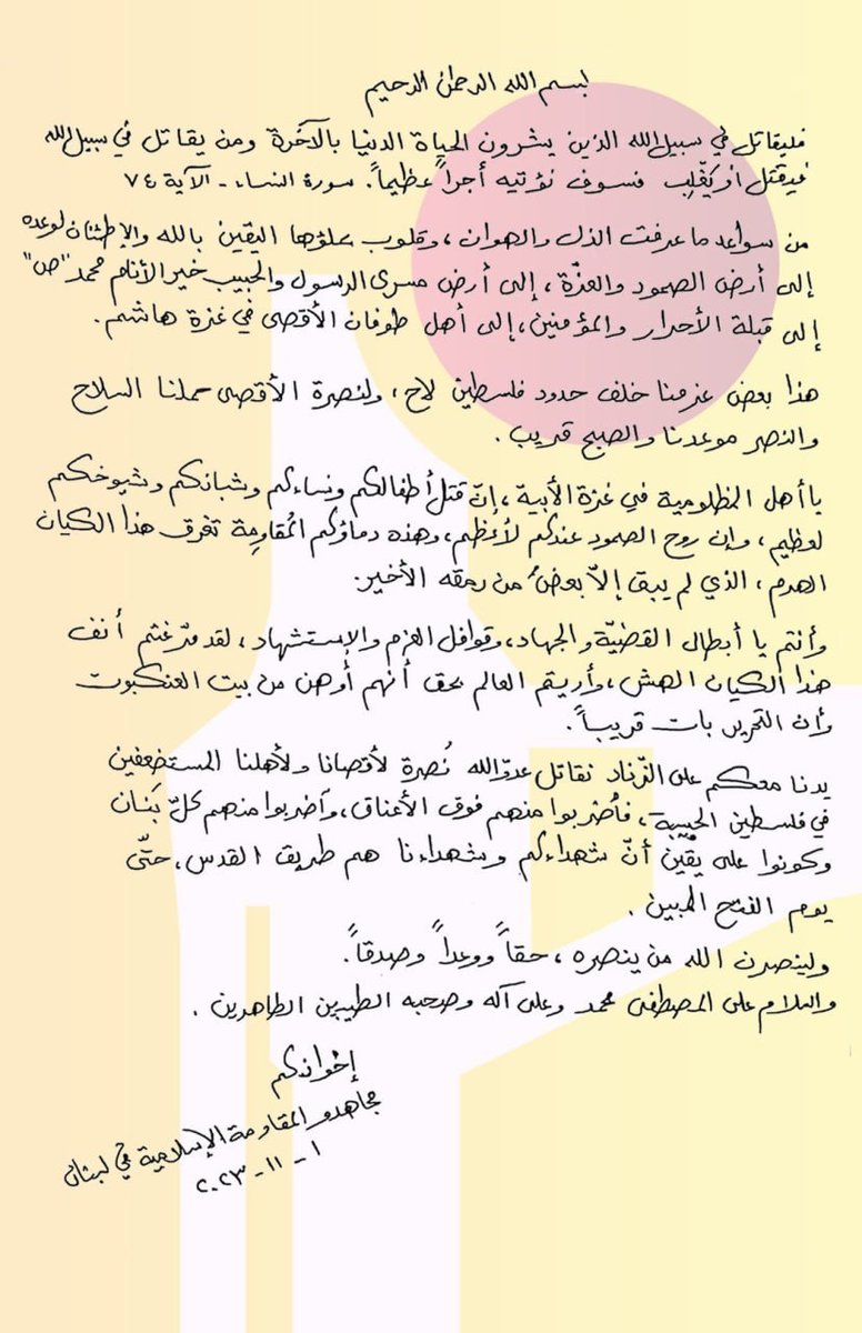 🚨BREAKING - OFFICIAL STATEMENT BY HEZBOLLAH TO HAMAS: "A message from the Mujahideen of the Islamic Resistance in Lebanon to the brave Mujahideen of the Resistance in the Gaza Strip and all of occupied Palestine: In the name of God, the most gracious, the most merciful Let those who trade the life of this world for the hereafter fight in the cause of God. And whoever fights in the cause of God and is killed or overcomes - We will give him a great reward - God the Most High, the Great, has spoken the truth - Surah An-Nisa, verse 74 From forearms that have known humiliation and disgrace, and hearts filled with certainty in God and reassurance in His promise, to the land of steadfastness and glory, to the land of the landing place of the Messenger and the Beloved, the Best of Mankind, Muhammad (PBUH), to the Qiblah of the free and the faithful, to the people of the Al-Aqsa Flood in Gaza, Hashem. This is some of our determination beyond the borders of Palestine. To support Al-Aqsa, we took up arms. Victory is our date and the morning is near. O oppressed people of proud Gaza, the killing of your children, your women, your young men, and your old people is great, and your spirit of steadfastness is even greater, and this blood of your resistance is drowning this aging entity, of which only a portion of its last breath remains. And you, heroes of the cause and jihad, and convoys of determination and martyrdom, have rubbed the nose of this fragile entity, and truly shown the world that they are weaker than a spider’s web and that liberation is imminent. Our hand is with you on the trigger, as we fight the enemy of God in support of our most vulnerable people and our oppressed people in beloved Palestine, so strike them above the necks, and strike them with every finger, and be certain that your martyrs and our martyrs are the path to Jerusalem, until the day of the clear conquest. And may God help those who support Him, in truth, promise, and sincerity. Peace be upon the Chosen One Muhammad and upon his good and pure family and companions. Your brothers Mujahideen of the Islamic Resistance in Lebanon"