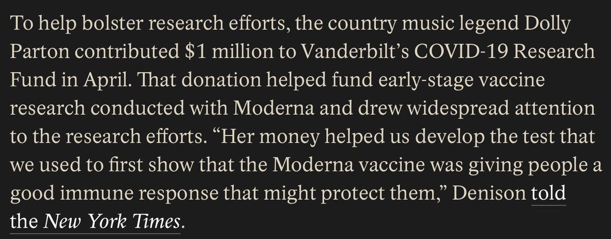 An Open Letter to Dolly Parton : Hi @DollyParton, A few years back you donated one million dollars to Vanderbilt University and their COVID-19 research. That money helped fund early-stage vaccine research conducted with @moderna_tx for the safety of their covid shot. Later you helped promote that very product by posting pictures and video of you getting the jab, changing the lyrics of your classic song Jolene to "Vaccine," and even went as far as calling those who wouldn't get it cowards and "chicken squat." I wanted to follow up on this because since then a lot of people have tragically ended up severely injured from the Moderna covid shot you helped make happen. Maybe you're aware of their stories, maybe you're not... but there are countless individuals worldwide who's lives have been ruined and will never be the same because of a misguided trust in government, big pharma companies, and influencers like you who encouraged them to get it. They have since been abandoned by all three. Their stories are often ignored, mocked, and heavily censored online. Most of these people are now left with astronomical medical bills and the overwhelming stress of seeking out funds to help pay for them because vax manufacturers like Moderna are free from liability, and our leaders in Washington have offered no assistance to those harmed by them. This is piled on top of the pain and suffering they face from the jab. SO -- I noticed in a new ad you just made for Salvation Army you proclaim it's the "giving season" ... and since it's the giving season, and since you gave so generously to Vanderbilt to help create something that has caused so much damage to so many lives, I wanted to see if you would consider giving an equally generous amount to my friends at @React19org - an organization devoted to helping the families of those injured or dead from these Covid shots. Please let me know what I can do to put you in touch, or educate you more on the situation with stories and info. Happy to provide whatever you need so we can get these people the help they need. Thanks, Brad Skistimas of Five Times August