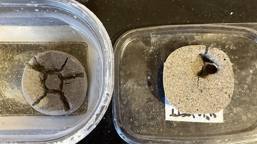 Here’s a better photo of the two potassium based artificial (fake) granite. On the left: from Székesfehérvár granite grains. On the right: from pavement filler sand. Remember: aesthetic depends on the type of grains used, nothing else. Can it be made from Aswan red granite grains? Ofc. But I don’t have that. So far so good. And beautiful. Let’s revisit them in a week. The 5% version has fallen apart by then 🫣