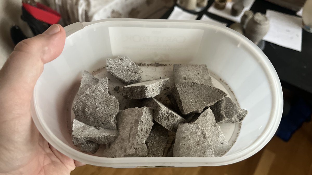 The potassium experiment. As I already told you, the fake granite created with the “usual suspect”, sodium waterglass is indoor only. It IS waterproof, but loses its strength spending a night underwater. Which is not a big problem but still. The next possible ancient waterglass is potassium waterglass, which is sold today for “waterproof coating”, so it IS waterproof to the maximum. How do you create that version with caveman resources only? Using wood ash lye. Okay, let me show you the current state of this experiment 🧪. I already failed a few times with this, first, by using very weak, diluted potassium waterglass, and then by adding 5% “secret material” catalyst which made the stone brittle. This time, it contains 2% “secret catalyst” only, and so far so good. Naysayer: the “secret catalyst” is not a real secret, I told it to hundreds of people already, under two conditions: 1. This is me who will reveal the “secret” at a later time, not you. Also called an NDA. 2. You cast a piece of stone for the public as a proof of concept. Are you in? Then you can get the “secret ingredient” info. Just dm me.