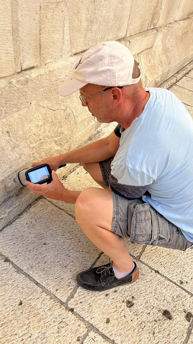 The Split Trap. A 🧵 1. The Mission In July 2025, armed with an XRF device, I traveled to Croatia to find out whether the limestone blocks with nubs contain any foreign material — in other words, whether they’re natural or man-made. This device can determine which atoms are present in a thin surface layer of a material by analyzing its X-ray backscatter. Since my artificial stone mixture contains potassium, that’s exactly what I was looking for in the ancient stones.