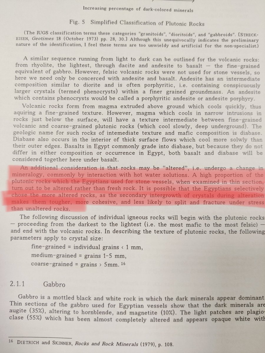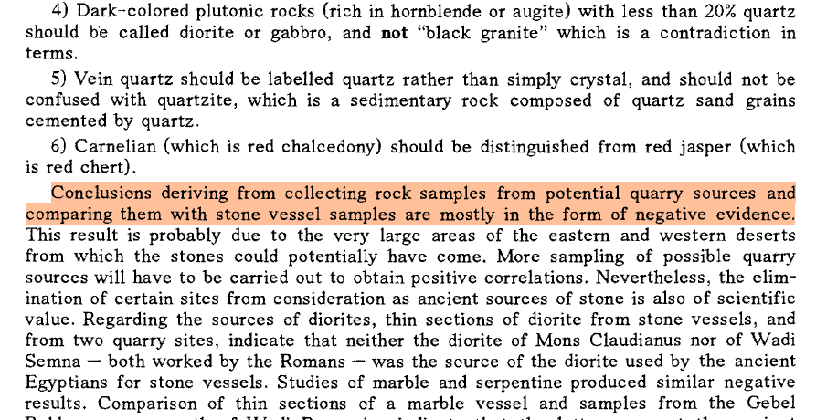 5. Uh-oh. How many vases did she examine? Forty-three. And how many quarries did she analyze? Eighteen. And there’s no match. How is that possible? Did the Egyptians import the stone for all the vases? That’s nonsense. So what could be the explanation? Once we get over the initial shock, we can go back to the beginning of the book and highlight the oddities that @Antanarivo_88 noticed early on. Take a look at this: Page 12: “An additional consideration is that rocks may be ‘altered’, i.e. undergo a change in mineralogy, commonly by interaction with hot water solutions. A high proportion of the plutonic rocks which the Egyptians used for stone vessels, when examined in thin section, turn out to be altered rather than fresh rock.” Wait a second—hot water solution? What could that be? Alkalis, perhaps? Page 13: “The rock has been substantially altered, with up to 5% of the hornblende altered to actinolite, and the plagioclase becoming brown and semi-opaque in thin section (= saussuritized).” All I really understood from that was “substantially altered.” 😊 Page 14, regarding diorite vases: “The specific ancient quarry sites for the various varieties of diorite are not known.” Page 15, granodiorite: “The specific source of this rock is not known, though in general terms, it undoubtedly came from one of the plutonic masses in the Red Sea Hills.” So the quarry for these vases hasn’t been identified either—although “it surely came from somewhere in the Red Sea Hills.” Well, something had to be written about the origin if the quarry itself couldn’t be found. I won’t go on. This repeats for 200 pages: Quarry unknown. Quarry unknown. Quarry unknown. Altered rock. Altered rock. Altered rock.