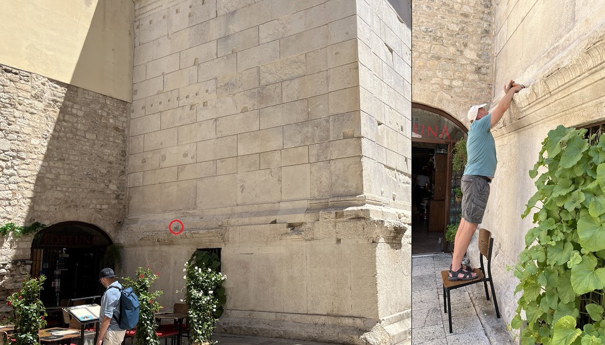 4. Diocletian Palace in Split My final destination was the city of Split, where the beautifully restored 2nd-century Diocletian’s Palace is the pride of the city. And sure enough, we find limestone blocks with nubs all over the place — sometimes in truly impossible locations, but that doesn’t deter a real researcher from scientific investigation. Out with the XRF device! No potassium. What the heck?