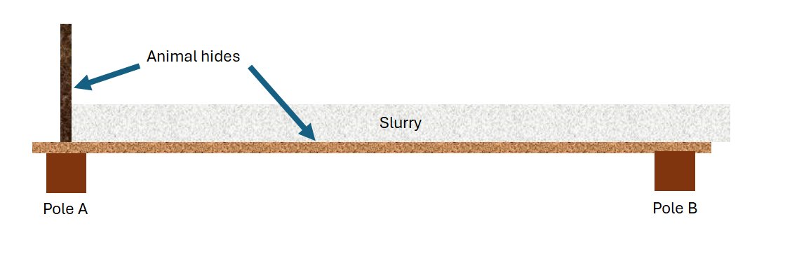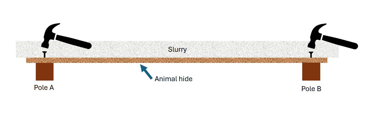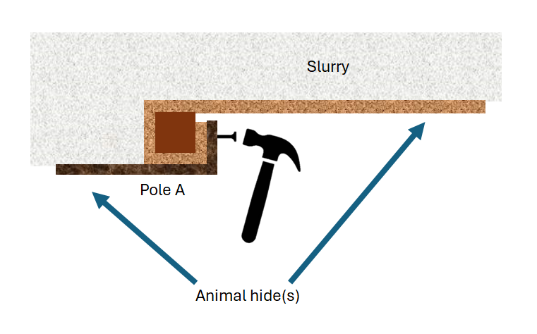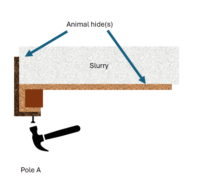 2. Now, if it’s animal hide, two things are necessary: 1. It has to be supported with planks from behind, otherwise it will inevitably bulge outward (aha!). 2. The hide has to be stretched tight, otherwise you get wrinkles in the cast stone. (Poor Incas did not have sophisticated shuttering, just a few wooden planks to keep the slurry in place behing the animal hide. Same casting technology btw.) And this is where the poles in both corners of the wall above come into play — perfect for stretching the hide across. So we stretch it! How?