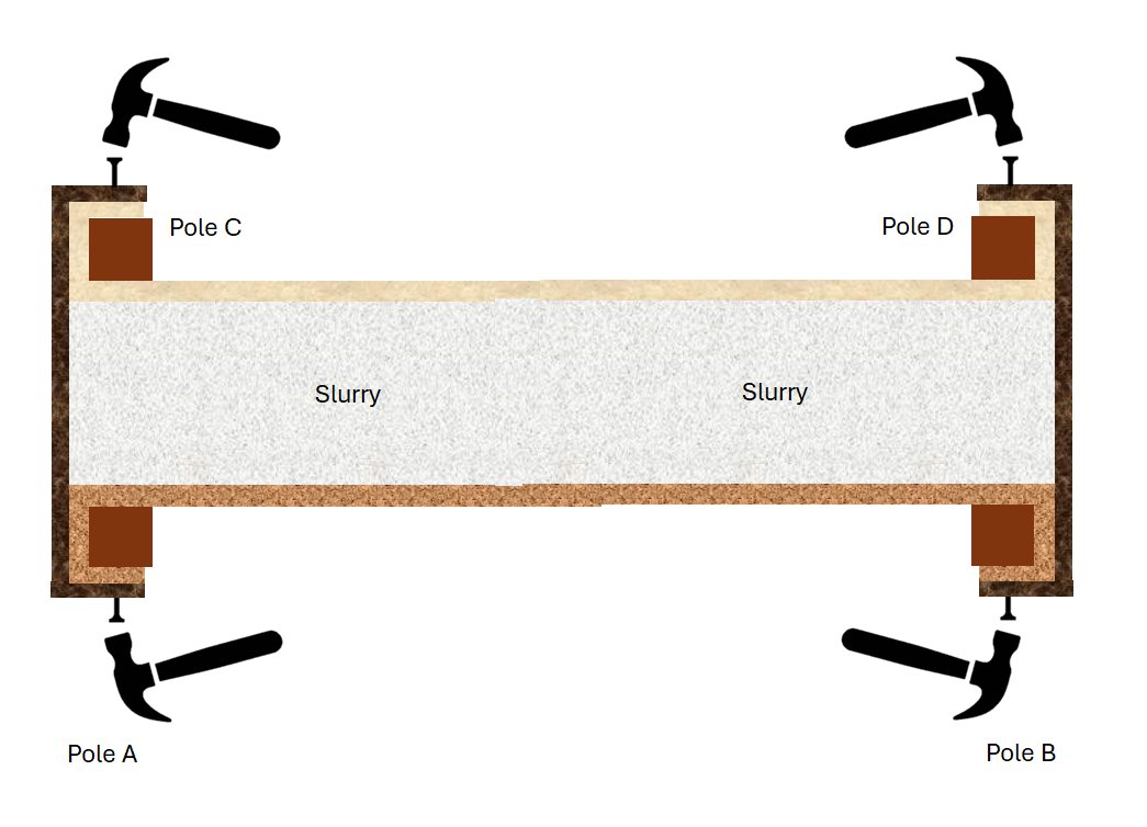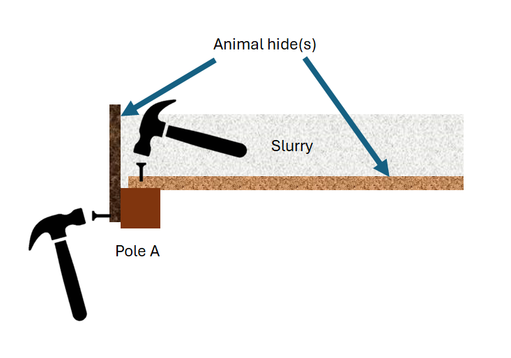 3. Well, just nale itt to the pole, right? Let me draw it for you from a top-down view. Egyptian Shuttering V1.0 Don't worry, this is not the final version, this one is dumb af for several reasons. First, you can’t stretch hide this way. Anyone who has ever tried knows you have to wrap it around the pole and then nail it. This way it’s completely unworkable — the slurry would just flow out between the nails. Second, we forgot to close off the left and right edges of the mold. The slurry would pour straight out the sides.