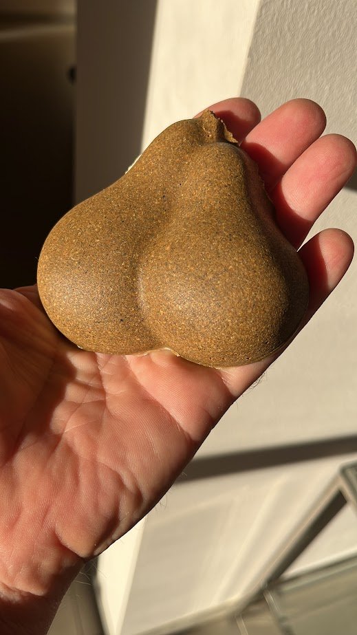 Day 2442246621463. My next result in the pic. Noooo, it’s not an ass, don’t be rude!These are pears 🍐🍐! The latest-greatest version of my artificial, recreated granite poured into a stolen sand mold. (Stolen from the kids from the sand pit.) Yes, it’s not red, it’s more like 💩, but that’s because this is the natural color of the granite grains I can source locally (from Székesfehérvár). But! If it looks like granite, walks like granite and quacks like granite, that’s not a duck 🦆!!! The next step is to find/buy/steal really beautiful RED granite grains and do it again. @JablonskyVik , you can safely throw away the sample you are drying in the desert for me. The whiskey version is not the real solution. This new version is waterproof from day one. I’ll tell you this fantastic new ingredient in DM. @MartinStrayd , you could do another meaningful, scientific and beautiful peer review if you accept the challenge 😉 Oh yeah. What’s the ULTIMATE additive I used this time? I tried gazillions of easy-to-find, everyday materials to have this result from the usual two ingredients: waterglass and granite grains. This is the latest finding. I had this material on the shelf since the beginning, but I didn’t use it in the mix because it’s totally counterintuitive to do so for several reasons. Like its color: WHITE. It’s a white powder. Surprisingly it turns transparent when you mix it with waterglass 😮 Yes, I’ll publish what it is later on. But you need at least a few days of uncertainty and mysticism before I tell you what it is. Until then, good luck guessing! 🍀