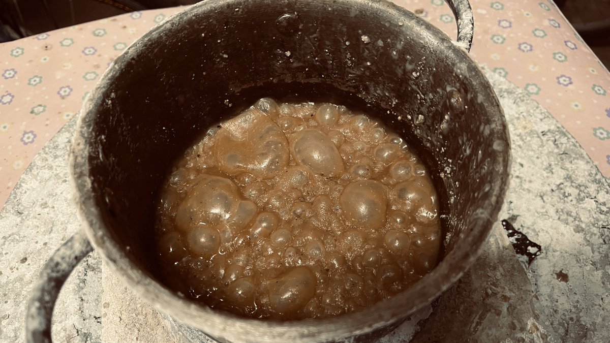 2. First, let’s see how I killed the long, boring hours of the Christmas break. Well, I cooked stone soup—Inca stone soup, to be precise. Here’s the recipe: 100 g water, 25 g NaOH, 25 g KOH, 100 g sand. Why exactly NaOH and KOH? That's a long story, it's just simulated peruvian wood ash lye, accept it as is. If you cook this slowly, over low heat, on a regular hot plate, all the way to full hardness—by that I mean concrete hardness—then some portion of the sand (we don’t know how much) turns into waterglass. The reaction isn’t complete because the temperature is too low, but that foam is definitely waterglass, born from the marriage of sand and alkalis.