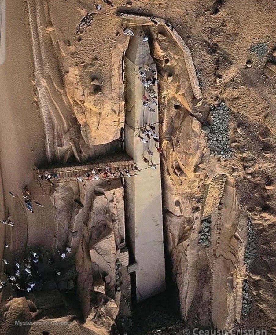 They did not. The obelisk is from a different material than the bedrock around it. Even this very photo is a proof of that. Watch the color difference. Another proof they didn’t is that there is no undecut below the obelisk, none, zero. The bottom of the pit is flat. The usual photo of the undercut you plan to show me now as a counter argument is a real photo indeed, it’s not fake, but was taken under another stone nearby in the same quarry. NOT under the obelisk! Now if all this 👆🏻is true (it is), what was the REAL plan with the unfinished obelisk? I honestly don’t know. But lifting and carrying was certainly not on their list.