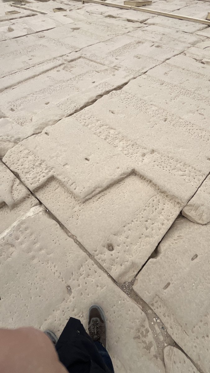 So I went to Dendera to see the “lightbulb” and the melted stairs, which I’ll analyze later. Because I found something absolutely mind blowing here, a serious proof of casting limestone. And casting just recently! (Okay, some 2000 years ago.) If we can accept the weird assumption that roofs are usually built after the walls of a structure, then… I found “cyclopean wall”, “cart routes”, depressions, a gazillion of square drill holes and everything else on the rooftop of the Hathor temple! A temple that was finished in the Ptolemaic era. Ooops! It’s very important to lick 👅 everything (which I didn’t do because I didn’t want to be arrested), and to climb up onto everything that is in your way. So I went up there and found absolutely everything you would find if a stone is CAST! NOT CARVED! Twitter let me attach 4 pictures only so I show you the “cart routes” and other interesting stuff below in a 🧵 1/4
