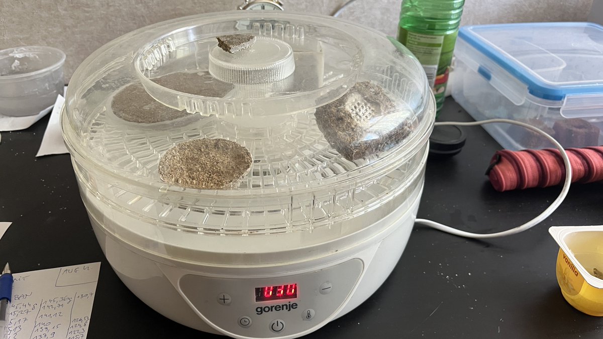 If you think it’s a totally irrelevant photo from a boring science lab, think twice. Because this can be the correct answer to the burning question why we find cast fake granite only in Egypt. There are all kinds of ancient artificial stones worldwide but beautiful, like fake rose granite, not a dirty grayish mess? That’s a thing that only appears in Egypt. Why? Because… From left to right: the same 1 year old fake granite pieces (from ordinary gravel this time) plunged into water. The difference? A new word I just recently learned: syneresis! Syneresis is the irreversible progression of silica hydrogel in which it loses all its water content — down to the last drop. This is when that bloody silica gel turns into stone for good. Now how is it possible that the left one fell apart after ONE YEAR of drying (but the other didn’t)? Well, as it turned out, this is because the humidity level is too high in my country to reach syneresis ever. @NatronTheory Martin I told you that it would take a lot of time for “your balls” to be waterproof. Now it looks like it’s forever in Hungary. I don’t know about Taiwan. So the piece on the right spent a day in the Sahara desert, and voila, that piece is everything proof now, including the hardest challenge ever: being waterproof. You may ask did I teleport that piece to the Sahara and back in one day? Close but no cigar. I have a Sahara machine at home. And if you’re collecting mushrooms 🍄🟫 like we do you probably also have one at home. It looks like this (next post):
