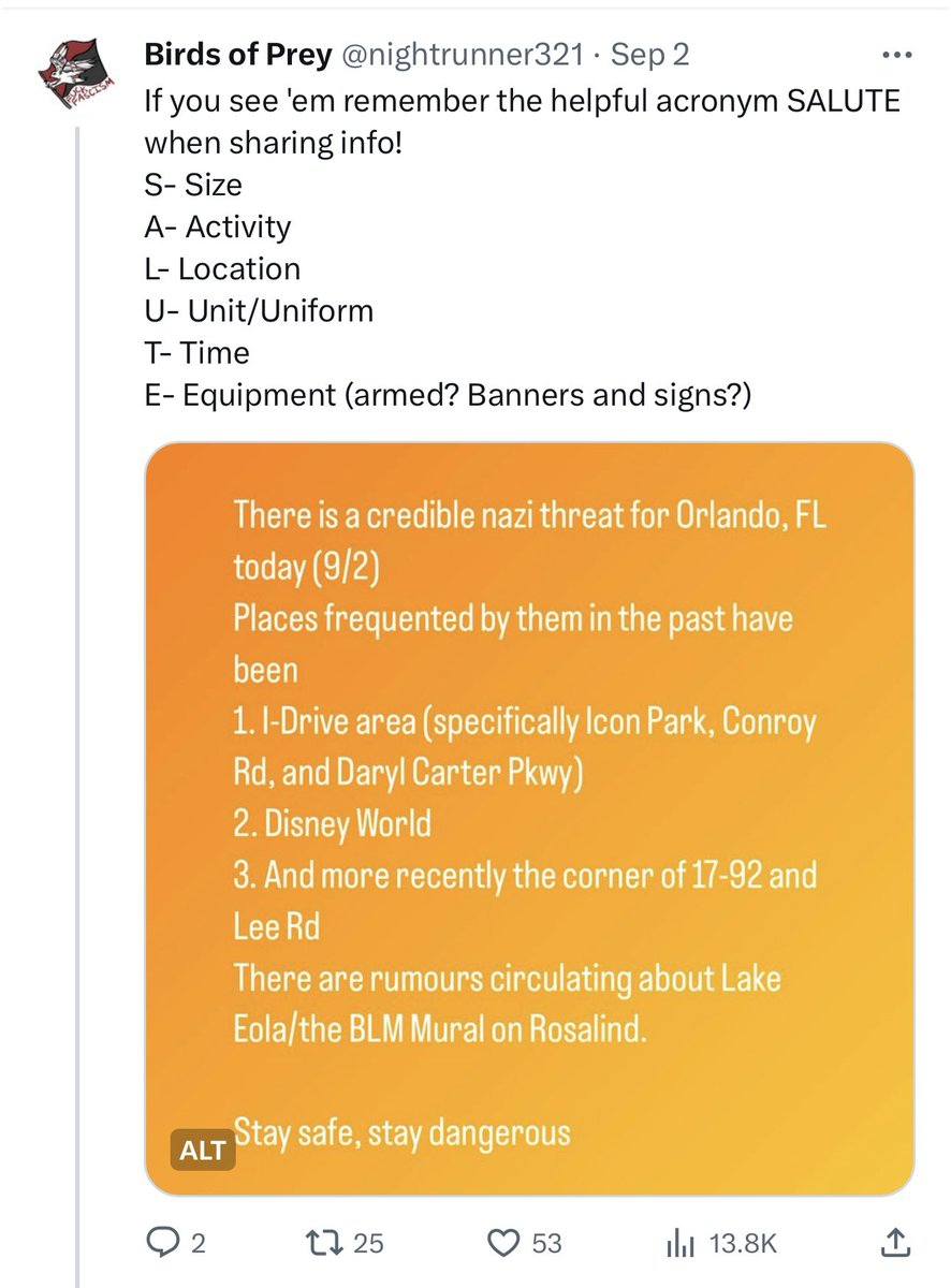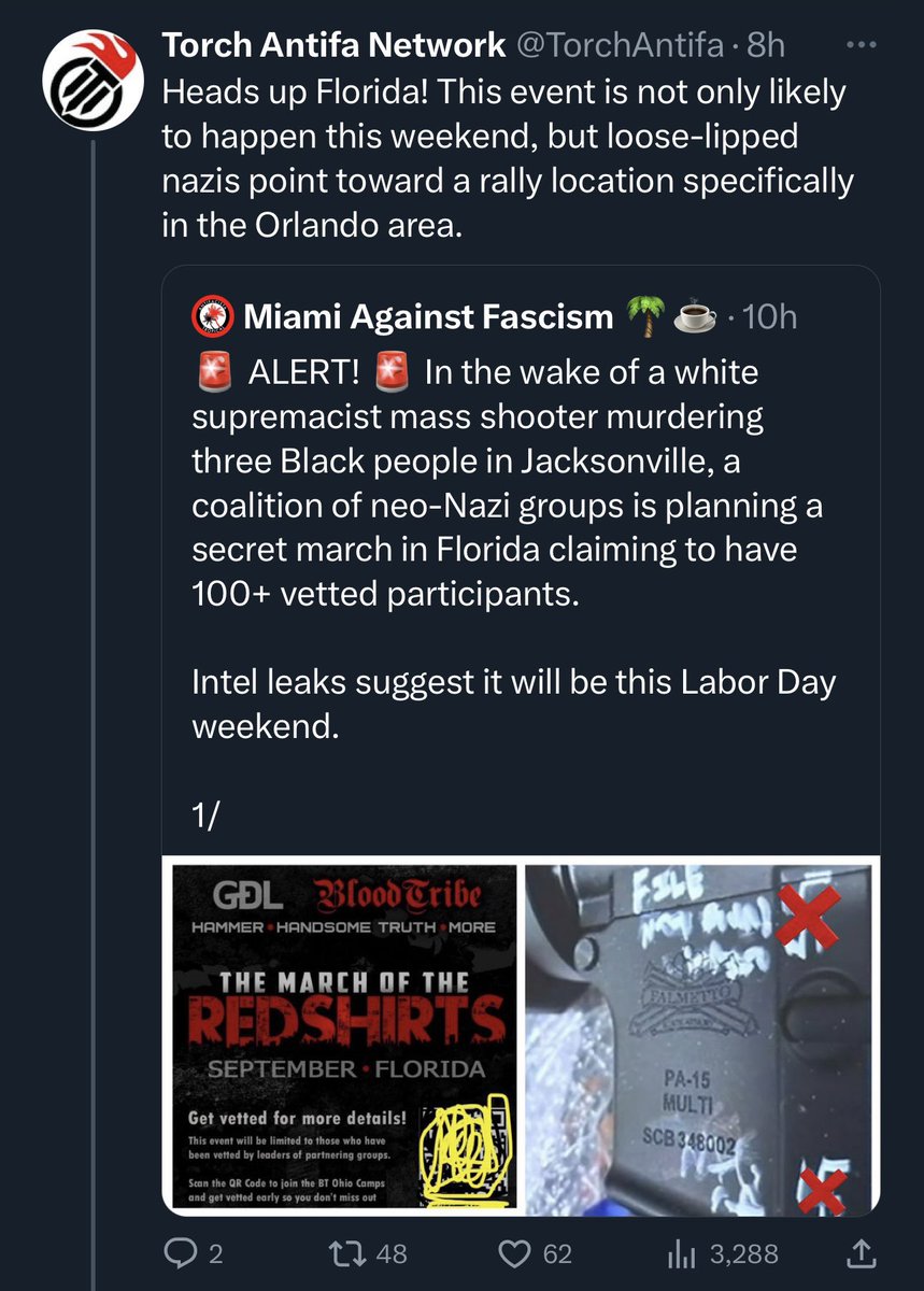 21) The Blood Tribe had announced this march more than a month ago, but they only said it would be in September and somewhere in Florida. It was actually anti-fascist pages that told the public it would likely be Orlando on this date, then a rumored location, and then a State Rep was the first to report the actual location as it was ongoing.