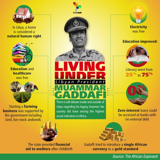 Libya Before: What They Never Told You We’re stepping just beyond the Middle East—but not out of the empire’s reach. 🇱🇾 Before NATO’s intervention, Libya was the wealthiest country in Africa. - Libyan Dinar was one of the strongest currencies in the world. - Gaddafi provided free housing, healthcare, and education. - Newlyweds received $50,000 from the government to start a family. - Gas was $0.14 per gallon. - Water infrastructure (Great Man-Made River) turned Libya into an oasis. 🔹 Then, the West decided Gaddafi had to go. For reasons 👇