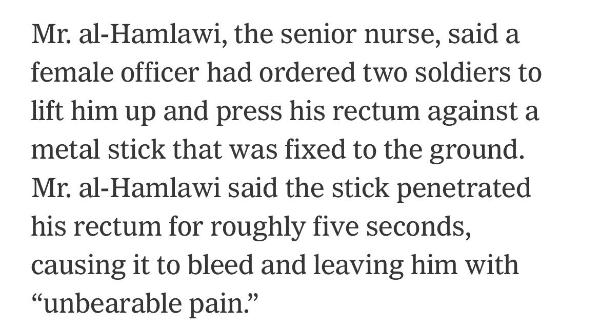 Impaling prisoners with metal rods in their rectum is the last of the thousands horrors Palestinians have had to endure these past 8 months. However, abuses, torture, mass killing, wanton destruction, have been the daily reality for the Palestinians under Israeli rule for over half a century. Now everyone can see. Israel operates as a military dictatorship, committing all sorts of crimes including #apartheid to the aim of removing the Palestinians from their land. It did not start on Oct 7. #StoptheGenocideNow