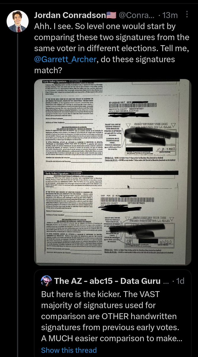 I played a game at @MaricopaVote this morning called "How long does it take me to verify a signature." Notes: -20 min. of training. -Random batches I selected. -Majority were easily ID'd in one second. -Digitized VR forms are the worst exemplars to work with. 1/2