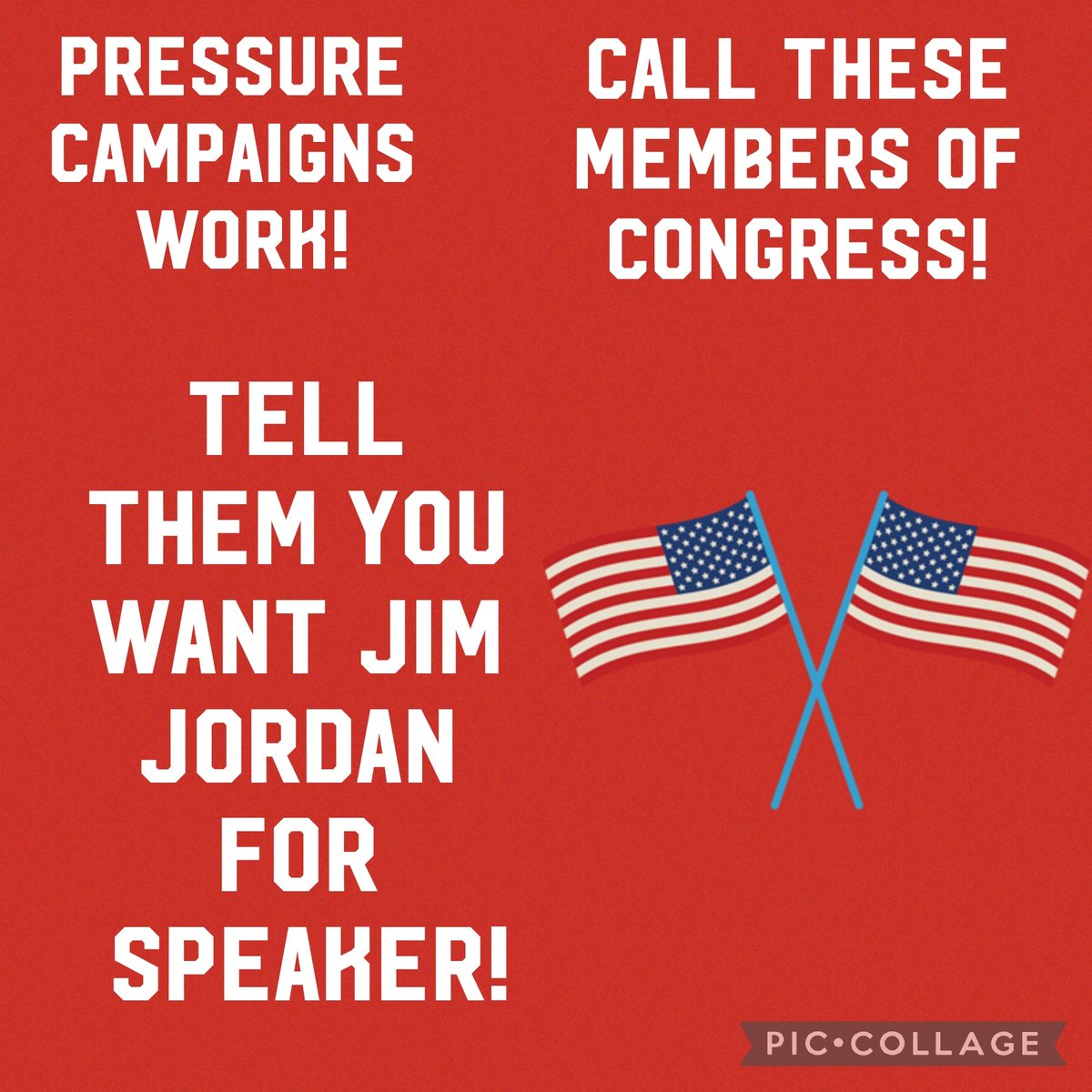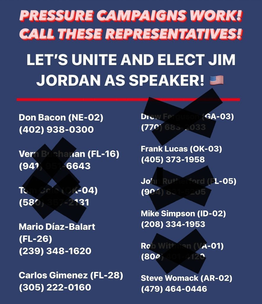 Last Minute UPDATE: These are the 9 Republican holdouts blocking Jim Jordan for Speaker! We need to flip 5! Call at 9am ET this morning! Don Bacon - NE @repdonbacon Phone: 202-225-4155 Mario Diaz-Balart - FL @MarioDB Phone: 202-225-4211 Carlos Giménez - FL @RepCarlos Phone: 202-225-2778 Frank Lucas - OK @RepFrankLucas Phone: 202-225-5565 John Rutherford - FL @RepRutherfordFL Phone: 202-225-2501 Mike Simpson - ID @CongMikeSimpson Phone: 202-225-5531 Steve Womack - AR @Rep_SteveWomack Phone: 202-225-4301 Ken Buck - CO @RepKenBuck Phone: 202-225-4676 Mike Lawler - NY @RepMikeLawler Phone: 202-225-6506