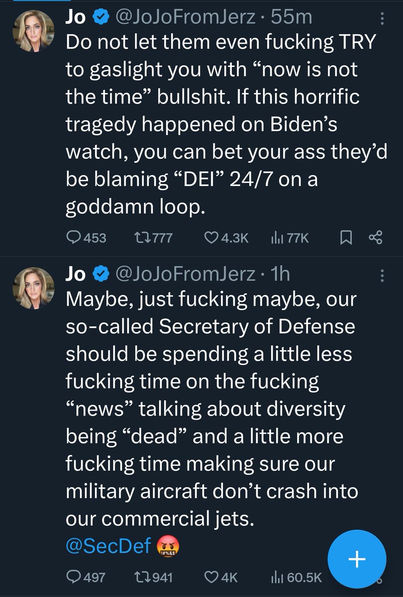 If you are in any way trying to blame the DC plane crash on Donald Trump, YOU ARE A TRASH HUMAN BEING. Be you JoJoFromJerz or CNN. Go F yourselves tonight. 🖕🏻 There are many dead Americans. 🙏🏻 https://t.co/aaVUsqgi7W