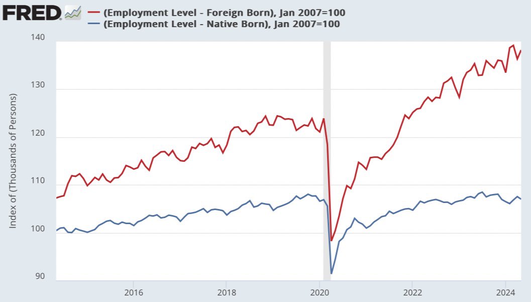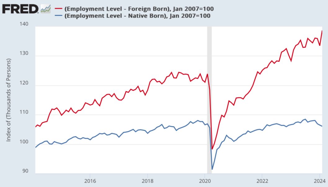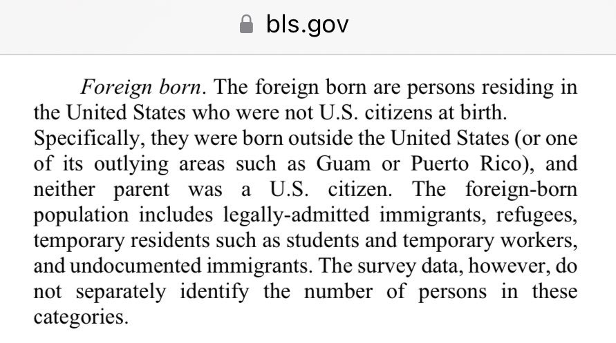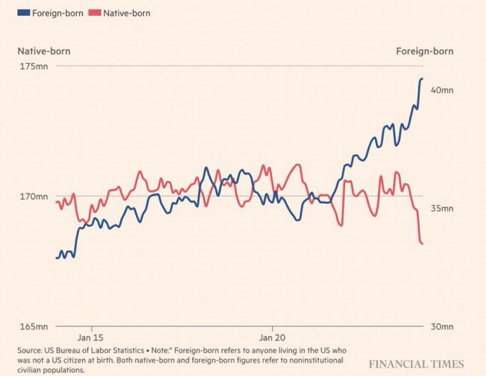 I specifically note “legal + illegal” immigrants because the Government does not seperate the two groups in their data for foreign-born workers. However, based on the numbers, I would assume a large percentage are illegal immigrants. https://t.co/7MT6WflGHF