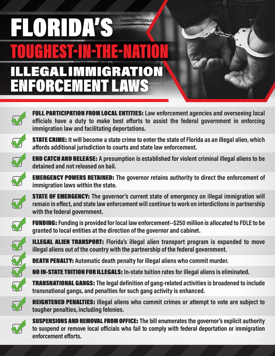 The bill I signed today ensures that Florida will set the standard for state action to end illegal immigration and deport illegal aliens. Florida now has the strictest laws of any state to combat illegal immigration. Our legislation: ✅ Makes it a state crime to enter Florida as an illegal alien ✅ Requires state and local law enforcement to assist the federal government in immigration enforcement ✅ Enumerates the governor’s authority to remove local officials who fail to cooperate with federal deportation or immigration enforcement efforts ✅ Prevents the ‘catch and release’ of illegal aliens by establishing the presumption that they will not be released on bail ✅ Eliminates in-state tuition for illegal immigrants ✅Enhances criminal penalties for transnational gangs and offenses committed by illegal aliens, including voter crimes When the Biden Administration invited illegal immigrants to pour into our country, every state became a border state. Now, every state in the nation has the opportunity and the duty to follow Florida in enacting the strongest possible laws to restore America’s sovereignty.
