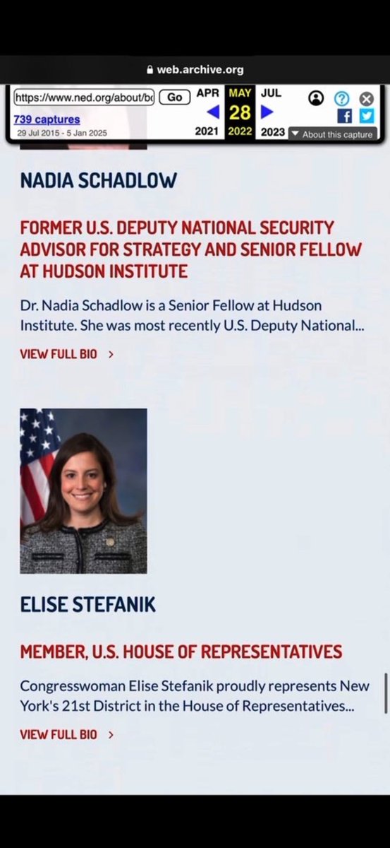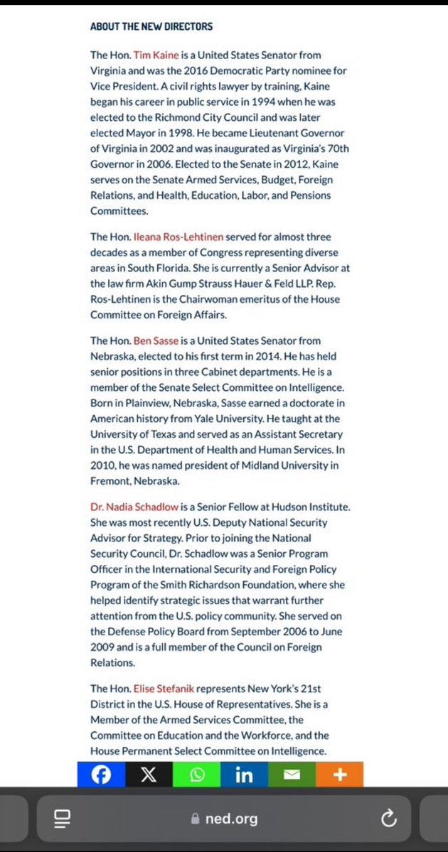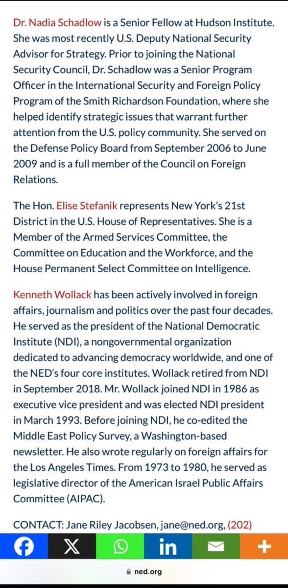 National Endowment for Democracy (AIPAC) ELISE STEFANIK, NED Director BEN SASSE, IQT (CIA) Trustee, NED Director *Kenneth Wollack, NED Chairman, AIPAC National Political Director *LA Mayor Karen Bass, NED Vice Chairman *Peter J. Roskam, NED Vice Chairman, Sidley Austin (Apollo), Benghazi Committee