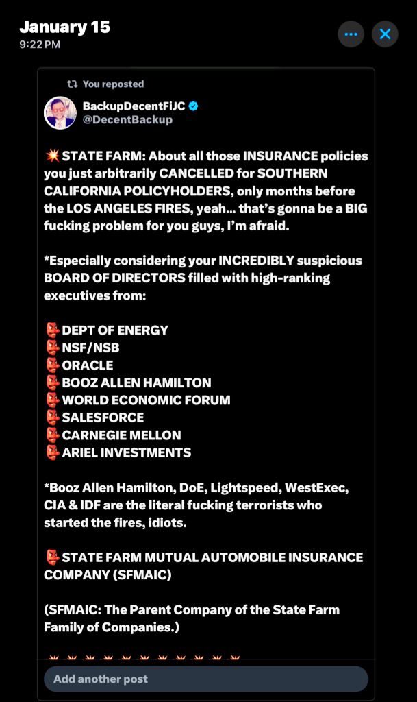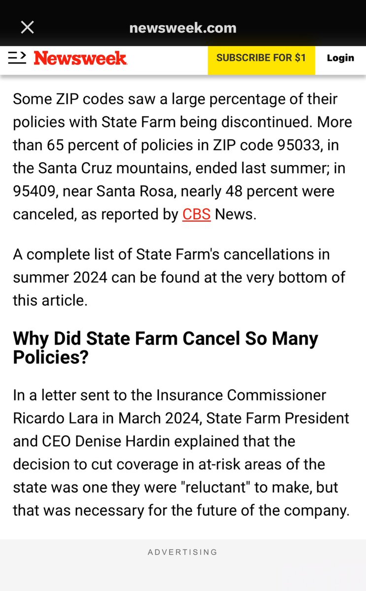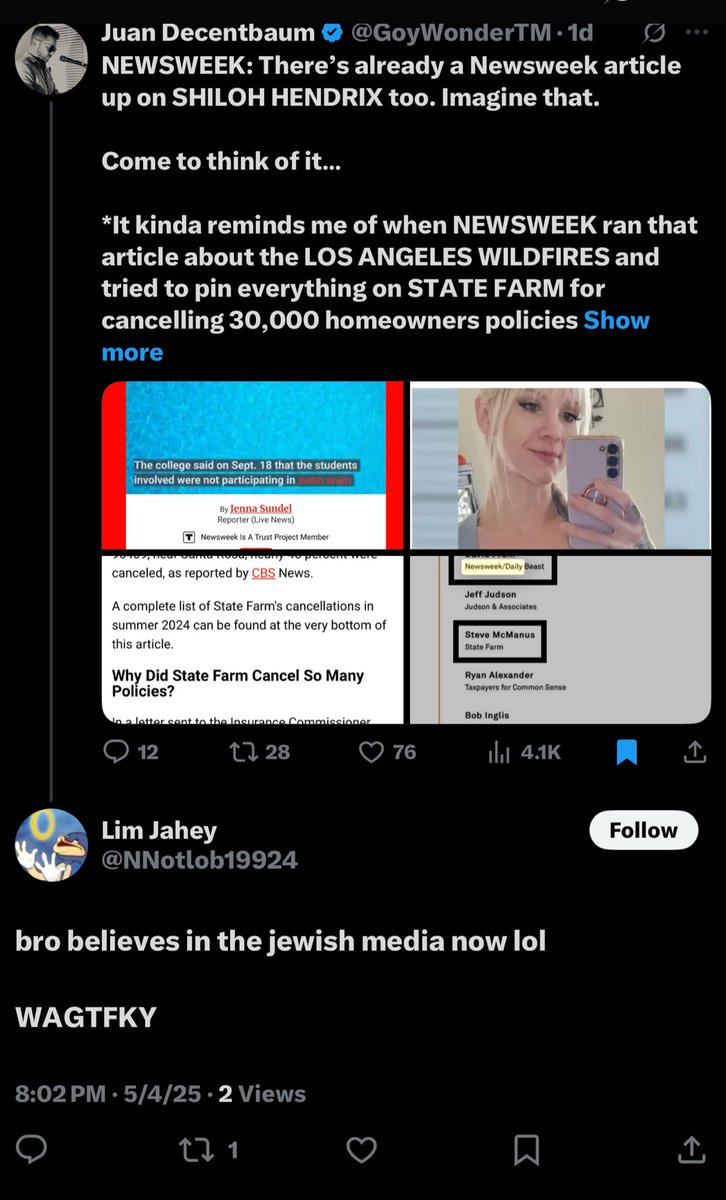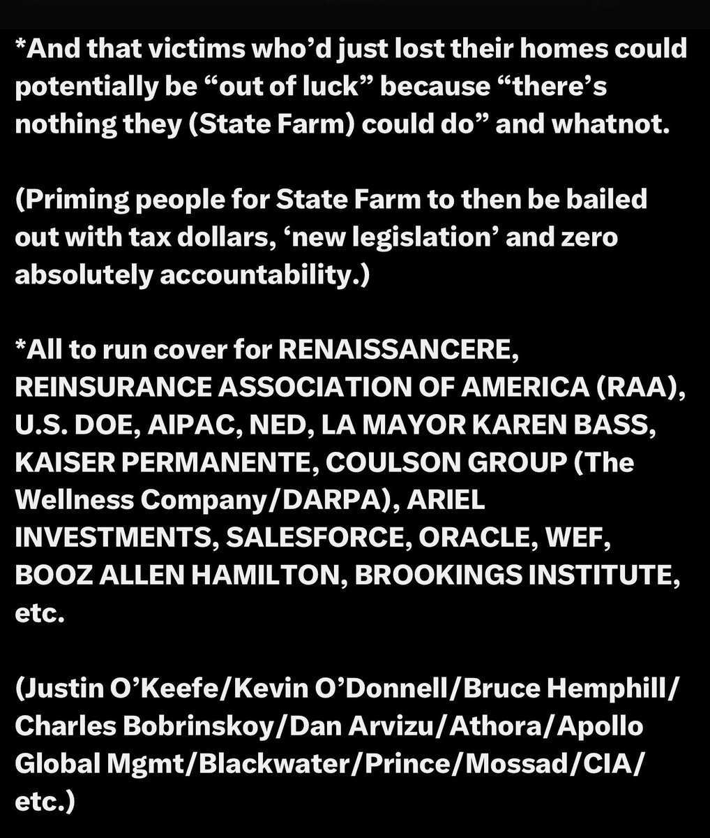 NEWSWEEK: There’s already a Newsweek article up on SHILOH HENDRIX too. Imagine that. Come to think of it… *It kinda reminds me of when NEWSWEEK ran that article about the LOS ANGELES WILDFIRES and tried to pin everything on STATE FARM for cancelling 30,000 homeowners policies (due to heightened risk) before the wildfires — making State Farm seem like both the main culprit and victim of an unavoidable, unlucky situation. *And that victims who’d just lost their homes could potentially be “out of luck” because “there’s nothing they (State Farm) could do” and whatnot. (Priming people for State Farm to then be bailed out with tax dollars, ‘new legislation’ and zero absolutely accountability.) *All to run cover for RENAISSANCERE, REINSURANCE ASSOCIATION OF AMERICA (RAA), U.S. DOE, AIPAC, NED, LA MAYOR KAREN BASS, KAISER PERMANENTE, COULSON GROUP (The Wellness Company/DARPA), ARIEL INVESTMENTS, SALESFORCE, ORACLE, WEF, BOOZ ALLEN HAMILTON, BROOKINGS INSTITUTE, etc. (Justin O’Keefe/Kevin O’Donnell/Bruce Hemphill/Charles Bobrinskoy/Dan Arvizu/Athora/Apollo Global Mgmt/Blackwater/Prince/Mossad/CIA/etc.) *But then I found R. STREET INSTITUTE and unwound the timeline of their coordination and ruined that terrorist horseshit op too? *And then STATE FARM REVERSED COURSE and went all “Lol, we were j/k… we’ll cover those policies and stuff! Pls don’t be mad!” Good times.🤦🏻♂️😒🤬🖕