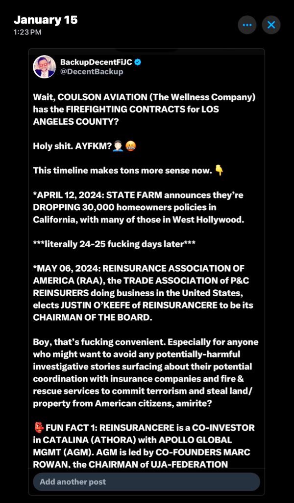 Why didn’t Coulson Group, the parent of The Wellness Company who’s contracted to provide aerial firefighting for Los Angeles County, put out the fires in Los Angeles? Was it because LA Mayor Karen Bass actually works for AIPAC (Mossad), Sidley Austin (Apollo Global Mgmt), Kaiser Permanente (McKinsey & Co.), State Farm (USDoE), Holocaust Memorial Council, Peter J. Roskam, Kenneth Wollack and Elliot Abrams at the National Endowment for Democracy (Israeli intel, CIA, 9/11 and COVID)? And why is the CEO of The Wellness Company some DARPA fa***t named Gillooly?