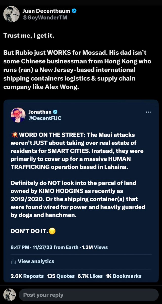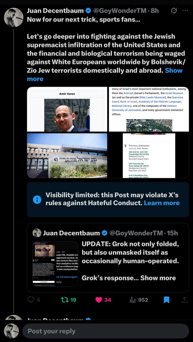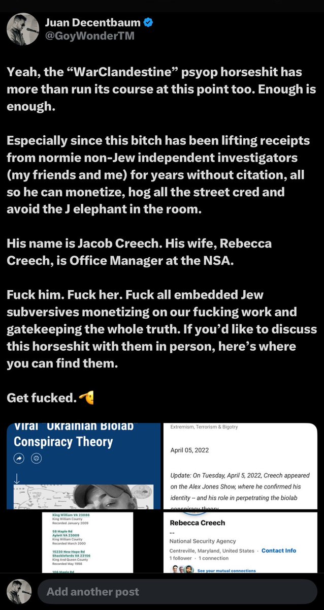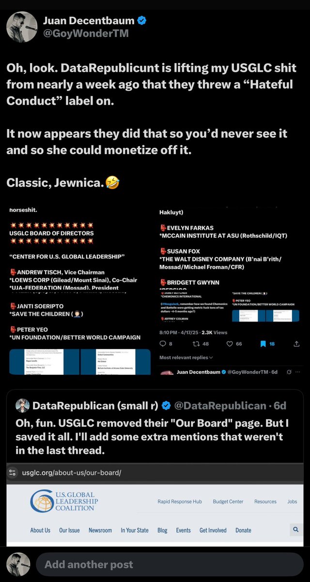 @EmeraldRobinson, My personal favorite is when they suspend your @DecentFiJC account with ~70,000 followers, more receipts on election fraud than anyone and one of the highest weekly engagements on the entire platform. All because you’re truly an independent, they can’t stop you from telling the truth, they can’t keep pace with the quality, volume and detail of your work, they hate the fact that you’re embarrassing all of their highly-monetized sacred cow mouthpieces and more than anything, you’re exposing THEM. So then, you create a @DecentBackup account, which soon reaches 30,000 followers of its own, and they suspend that too. But you keep going anyways. And now that you’re on alt account #8-9, and they’ve figured out “banning you” isn’t gonna work, they just start arbitrarily tossing “Hateful Conduct” labels on many of your more important exposés, so that nobody on @X can see/like/share them. A week or so later, they send out their newly-minted “astroturf cover-up” accounts to lift your “Hateful Conduct” shit verbatim, they pass it off as their own to monetize off it and garner “street cred” and then they have their dutiful Jewish “right-wing arbiters of investigation” like “I am extremely Jewish” @MikeBenzCyber fawn all over it like it’s the cure for cancer. Sometimes it’s @DataRepublican (Snapchat/Norwest/Lightspeed), sometimes it’s @NicoleShanahan (Google/Kleiner Perkins) and sometimes it’s just the plain ole NSA and @WarClandestine. But it’s all the same Judeo-Bolshevik bullshit.