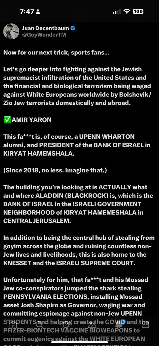 UPDATE: http://X.com thinks it’s “Hateful Conduct” to find the identity of the Jewish terrorist who’s running the Bank of Israel, colluding with treasonous Jewish terrorists (Rowan, Stevens, Shapiro) running UPENN & THE WHARTON SCHOOL, destroying America, stealing PA elections to install illegitimate MOSSAD assets, fomenting biological terrorism against WHITES (PFIZER-BIONTECH/JFNA), committing ESPIONAGE AGAINST NON-JEW COLLEGE STUDENTS at UPENN (UJA/ICC/Israeli MoSA), RIGGING AMERICAN COURTS — and then posting their AMERICAN HOME ADDRESSES on http://X.com. They want us poor American goy defenseless, not knowing where to find them. We’ll agree to disagree on that one, folks.🫡