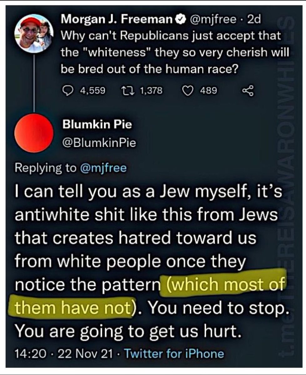 “…it’s anti-white shit like this from Jews that creates hatred toward us from white people ONCE THEY NOTICE THE PATTERN (which most of them have not).” Oh. Huh. https://t.co/ZwxIIxExc3