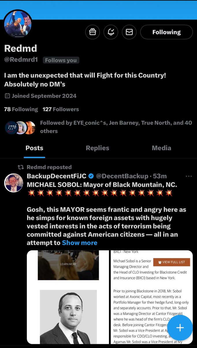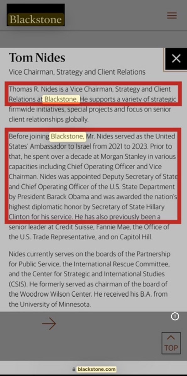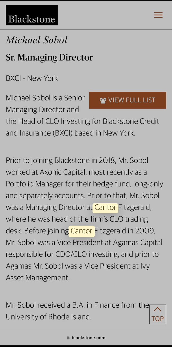 Speaking of CANTOR FITZGERALD… 💥Here we have HOWARD LUTNICK, the CHAIRMAN & CEO of CANTOR FITZGERALD, in the PARTNERSHIP FOR NYC and part of the DJT2 ADMINISTRATION. 💥And here’s MICHAEL SOBOL, a SENIOR MANAGING DIRECTOR at BLACKSTONE GROUP since 2018, who joined after having been MANAGING DIRECTOR at CANTOR FITZGERALD and HEAD of its CLO TRADING DESK. *MICHAEL SOBOL has the SAME NAME as the MAYOR of BLACK MOUNTAIN, NC who was freaking TF out about our exposing FEMA WORKERS for their overt WAR CRIMES and TERRORISM against WESTERN NC RESIDENTS during HURRICANE HELENE “disaster relief sabotage” and whatnot. Good times.🤣🖕