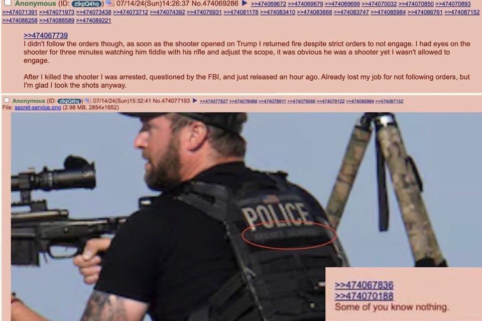 Slide 3: “I didn’t follow the orders though, as soon as the shooter opened on Trump I returned fire despite strict orders to not engage. I had eyes on the shooter for 3 minutes watching him fiddle with his rifle and adjust the scope, - - After I killed the shooter I was #arrested