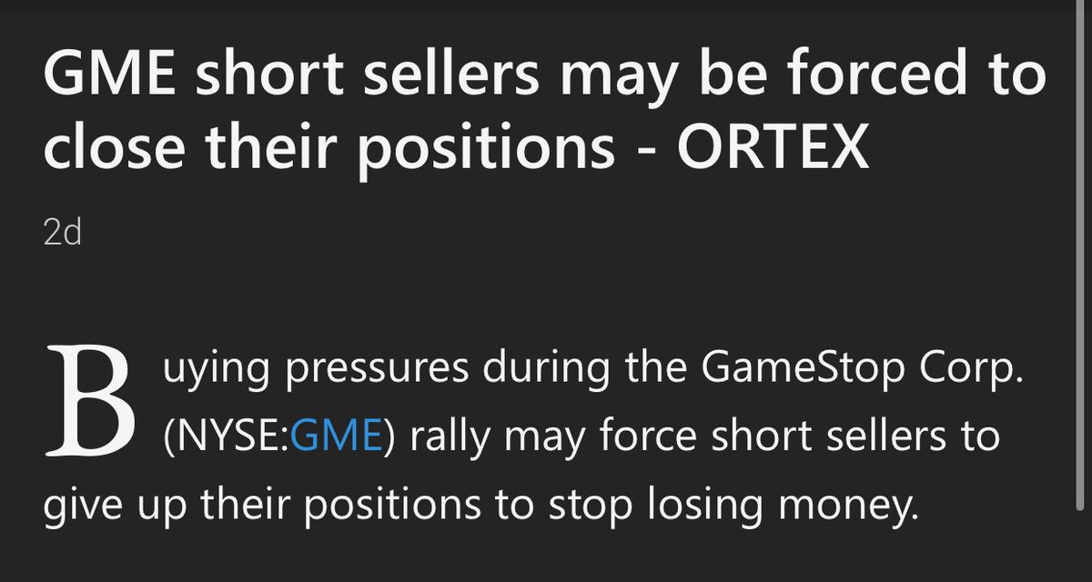 GME short sellers may be forced to close their positions - ORTEX 🎮 Buying pressures during the #GameStop Corp. (NYSE: $GME) rally may force #shortsellers to give up their positions to stop losing money 🎮 Short selling has taken over $1B losses today. Lies! https://www.msn.com/en-us/money/markets/gme-short-sellers-may-be-forced-to-close-their-positions-ortex/ar-BB1nxrAr