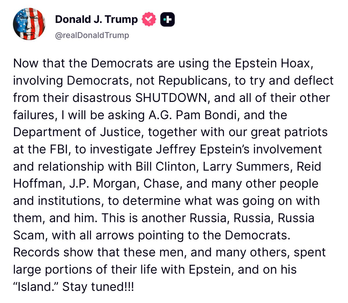 🚨BREAKING: President Trump just DESTROYED any narrative claiming that he DOESN'T CARE about the Epstein victims. They have OFFICIALLY F*CKED AROUND! "I will be asking A.G. Pam Bondi, and the Department of Justice, together with our great patriots at the FBI, to investigate Jeffrey Epstein's involvement and relationship with Bill Clinton, Larry Summers, Reid Hoffman, J.P. Morgan, Chase, and many other people and institutions, to determine what was going on with them, and him." Now, it's time for these crooks to FIND OUT!
