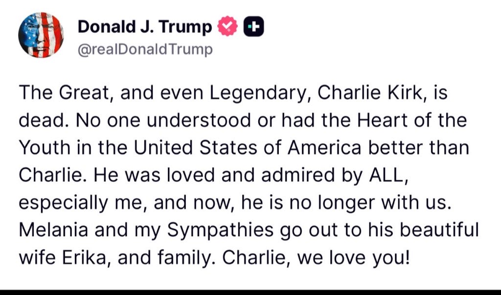From President Trump on the passing of Charlie Kirk: "The Great, and even Legendary, Charlie Kirk, is dead." ... https://t.co/uI9ILN1a7G
