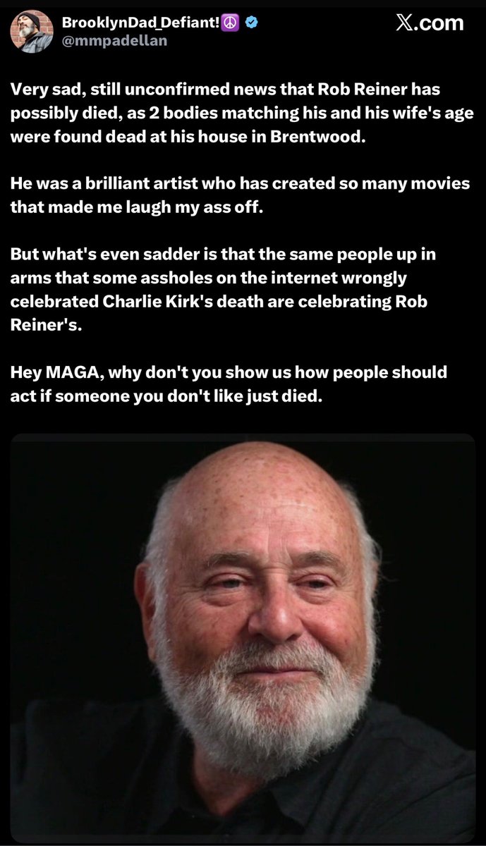 Liberals are desperately searching for a prominent conservative mocking Rob Reiner and his wife passing. I’ve seen nothing but statements like Andrew’s. They can’t cope with this simple fact. https://t.co/NWH9YjibJr