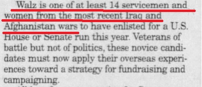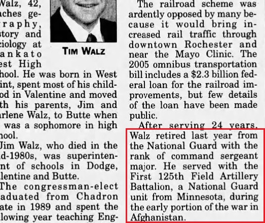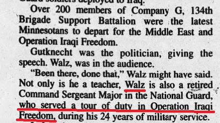"Walz...served a tour of duty in Operation Iraqi freedom" "Walz is one of at least 14 servicemen and women from the recent Iraq and Afghanistan wars" "Walz, a veteran of the war in Afghanistan" "He served...during the the early portion of the war in Afghanistan" Did all these papers just happen to invent the same false story of did they hear it from Walz himself?