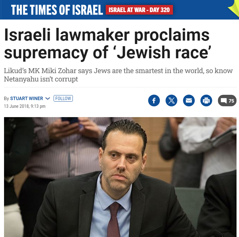 Mainstream government officials in Israel often go on record making Jewish supremacist statements. These officials are not punished for blatant racism. They are rewarded with even more popularity. https://t.co/EnAj1QTg1C